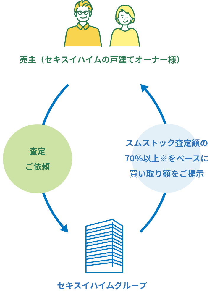 セキスイハイムのオーナー様のお住まいをセキスイハイム不動産をはじめとするグループ会社が直接買い取る場合は、早期に資産の現金化が可能です。今後の計画も立てやすくなります。